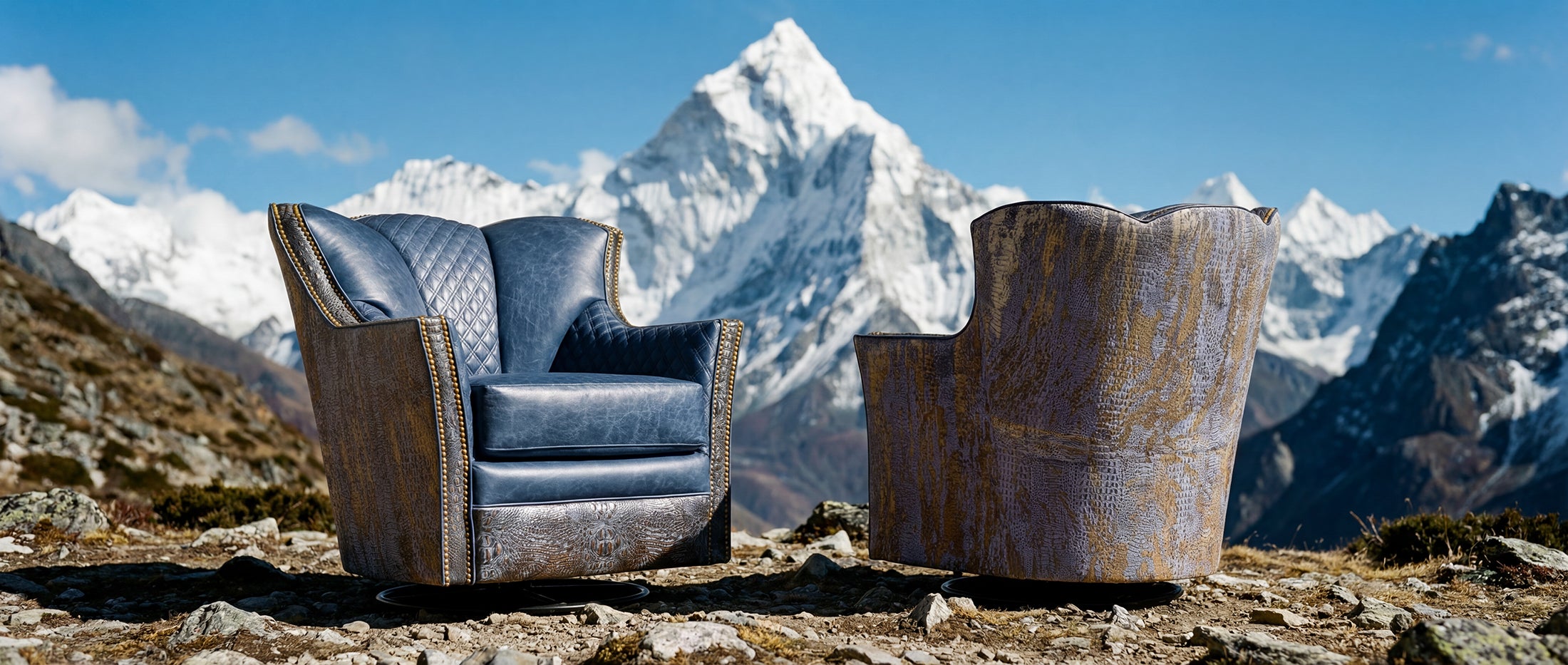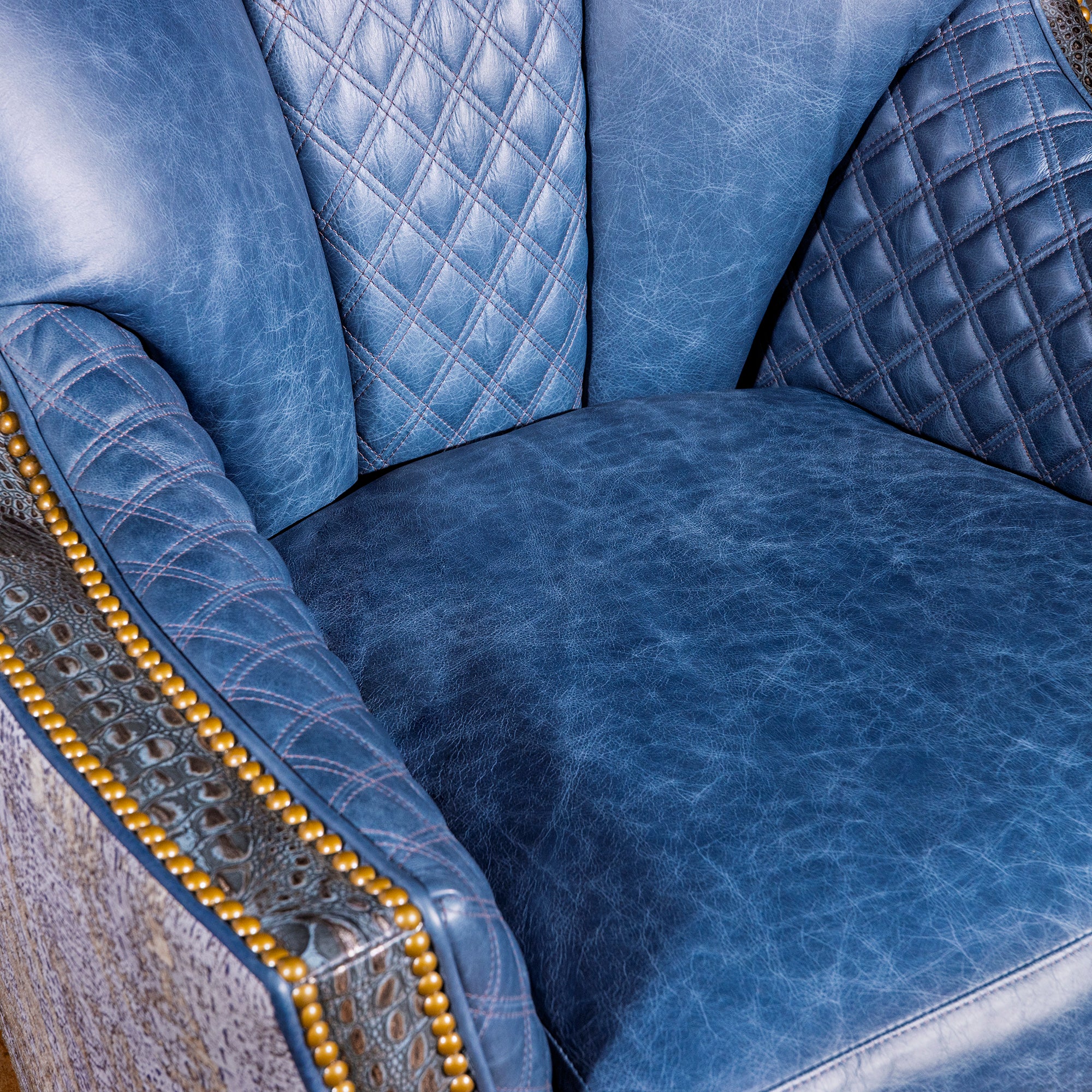 The Indigo Canyon Croc Swivel Chair is designed for rooms that don’t whisper. It pairs a deep, sky-blue leather body with quilted diamond panels that catch light like tailored outerwear—clean, confident, and built to hold presence without needing a loud silhouette.